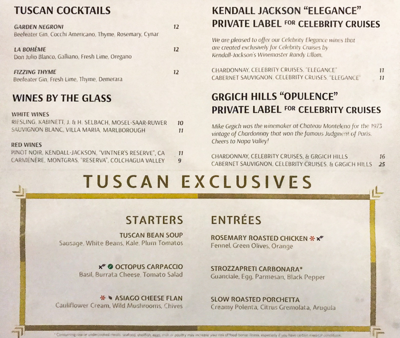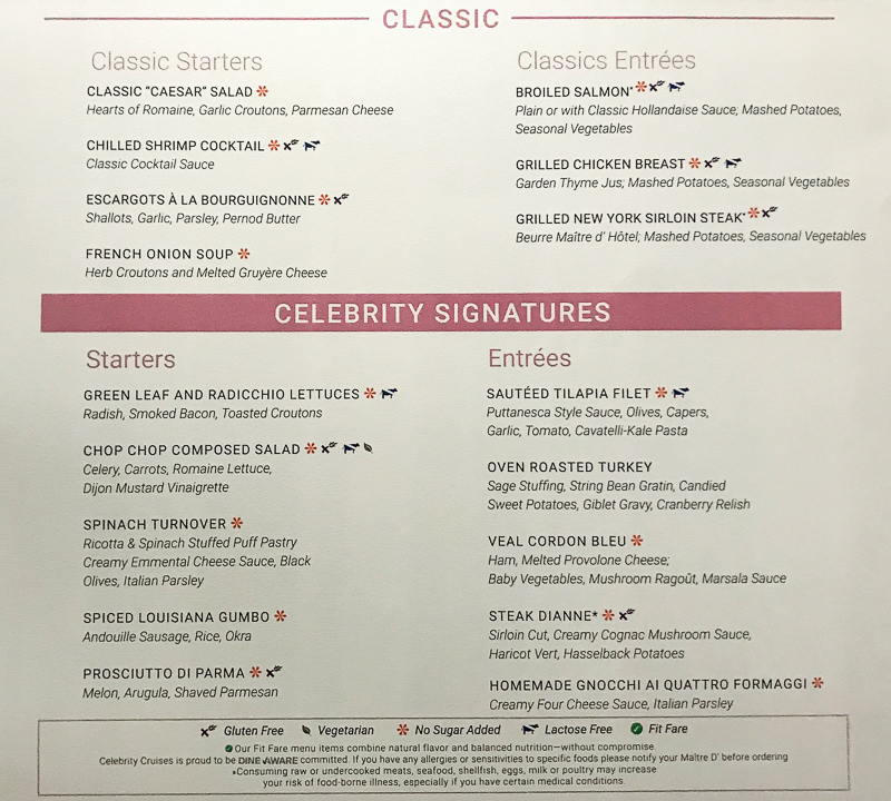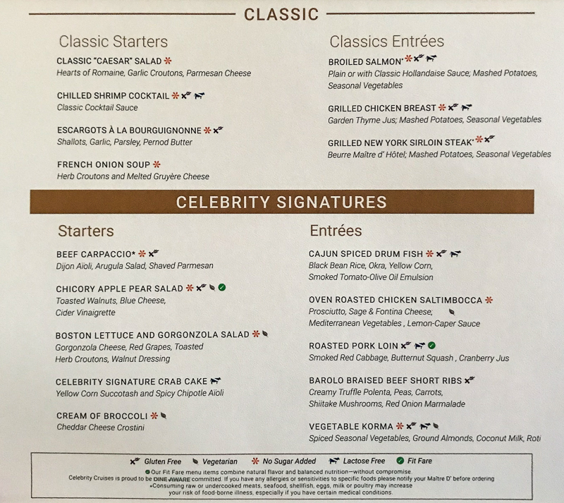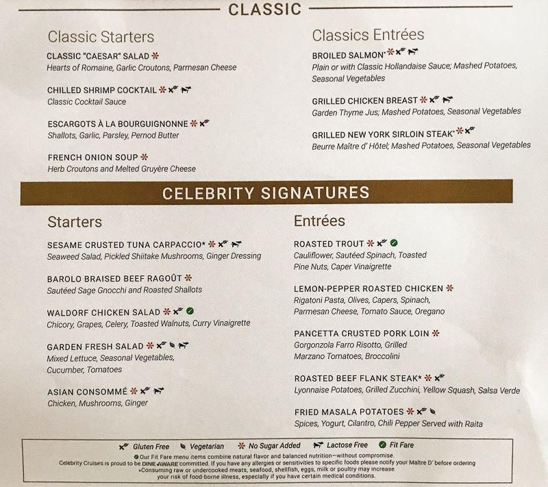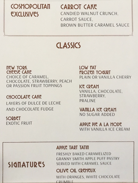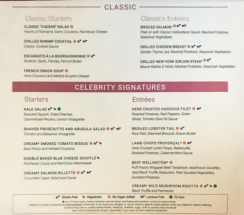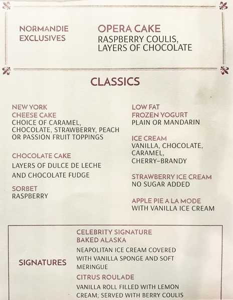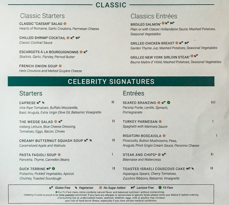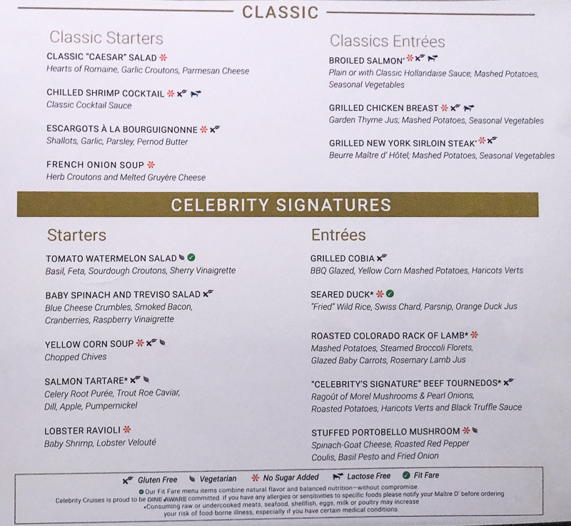 For some reason, when I asked for the menu to take a photo of after I ordered and returned the menu to the waiter, he gave me day 7 rather than day 1. I never noticed it until I was putting this page together. As is normally the case on Celebrity ships, they have prime rib on the first day.