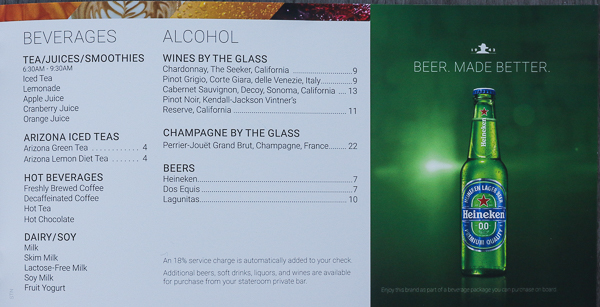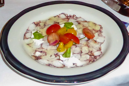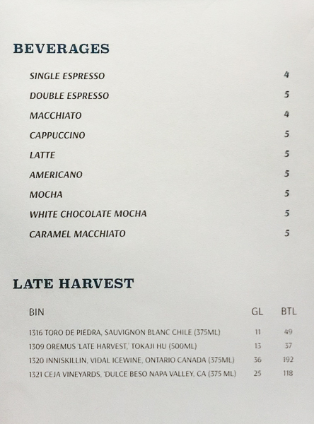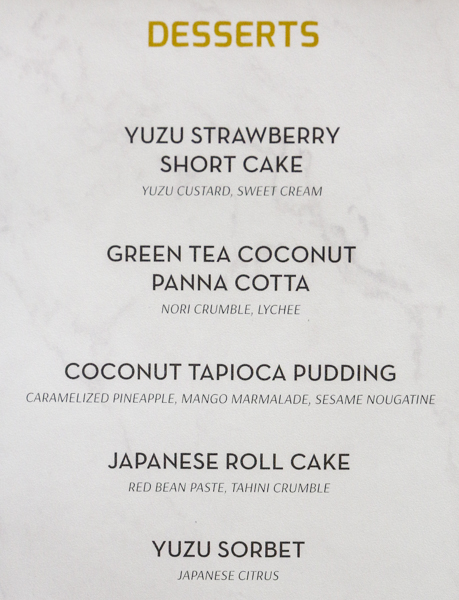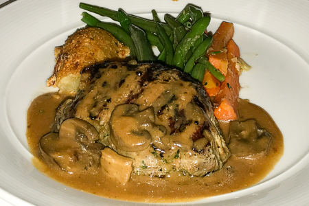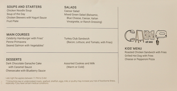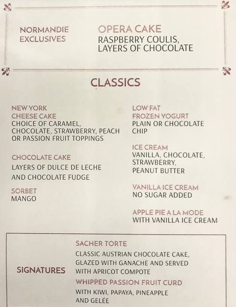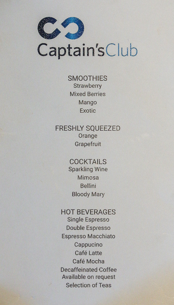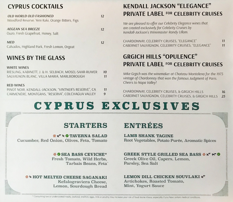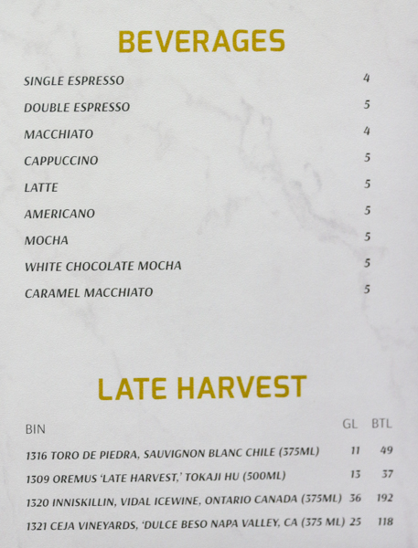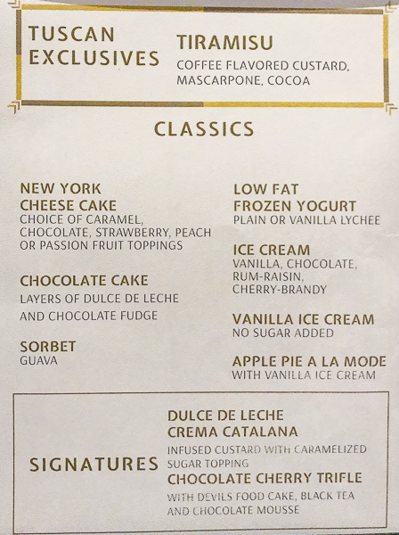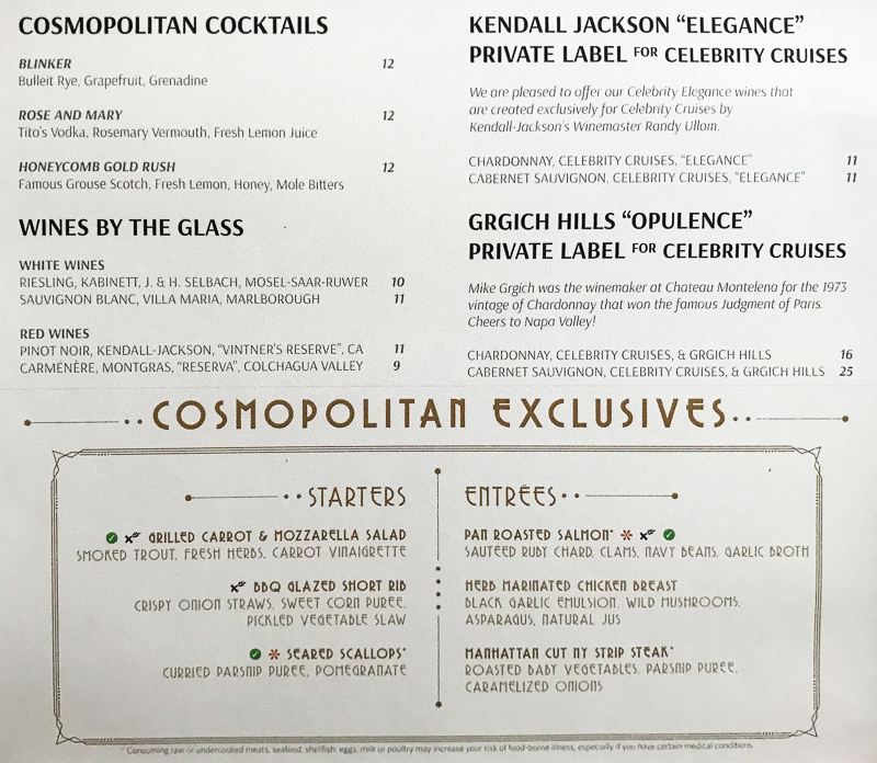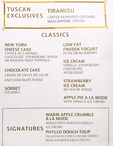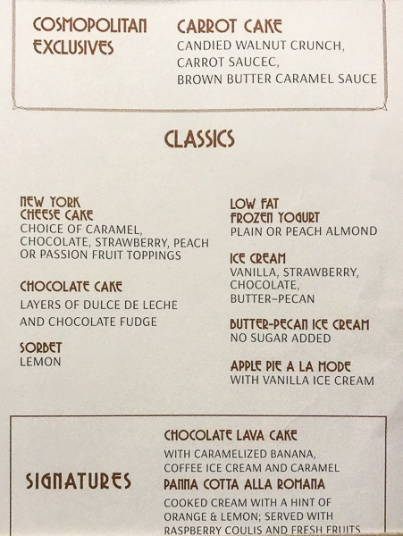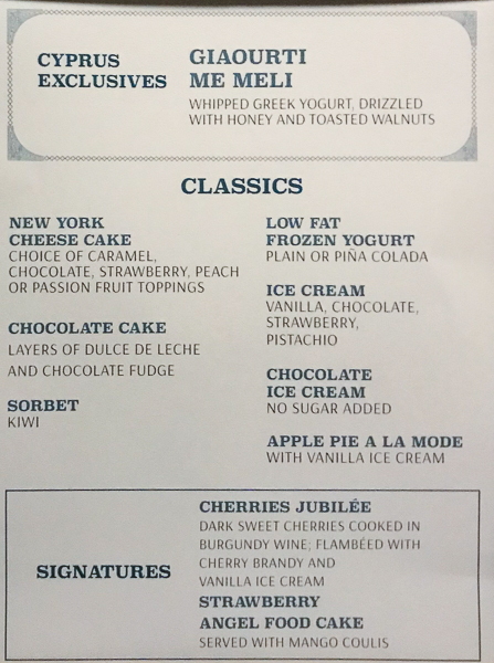 For some reason, when I asked for the menu to take a photo of after I ordered and returned the menu to the waiter, he gave me day 7 rather than day 1. I never noticed it until I was putting this page together. As is normally the case on Celebrity ships, they have prime rib on the first day.