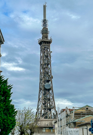 Along one side of the building is a communications tower that looks like a smaller version of the Eiffel Tower.