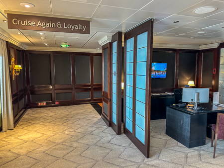 Cruise Again – Right next to the shore excursion desk is the Cruise Again office. This is where you can get assistance booking another cruise. Since they offer additional promotions to book a cruise while you are on board, it is a pretty popular place.