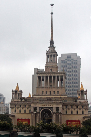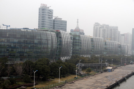 Finally we got close to the docking area and I could see what I had been waiting for. With the fog, I couldn’t see the tops of the building and couldn’t even see the famous Orient Pearl Tower; but we had arrived in downtown Shanghai. At last the tower came into view; but we could only see the lowest part of it. Now that was a bummer.