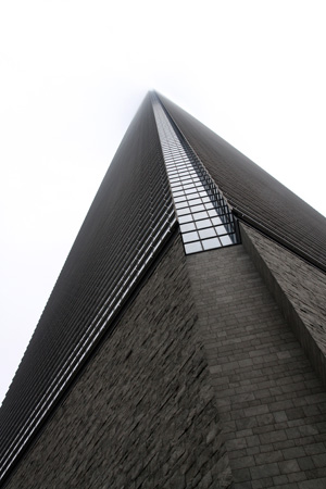 We drove to the Park Hyatt Shanghai hotel to get a view of the city from their free viewing area on the 87th floor. I was concerned when I looked up at the hotel that we might not have a clear view with the clouds obstructing it and another unusual cylindrical skyscraper.