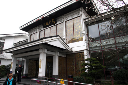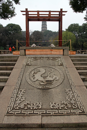 It is known as the Sword Pond, a small rectangular pond, beneath which a treasure of some 3000 swords are believed to have been buried. They have not excavated the site because the leaning pagoda's foundations rest on it.