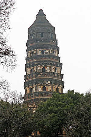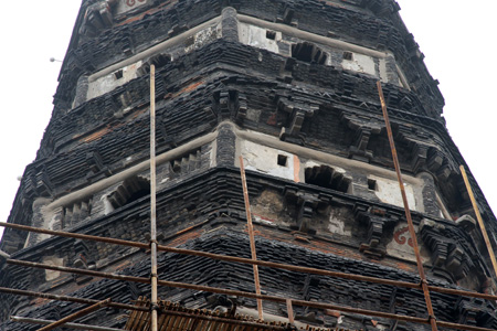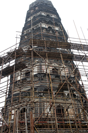 When we came to the pagoda, there was scaffolding on it. The entire structure is masonry and designed to imitate wood construction. The pagoda weighs 15,000,000 pounds. It did appear to need some renovation. But then again, it is the original construction from the year 907AD. Concrete was pumped under the pagoda in 1957 to help stop further leaning. It apparently helped.