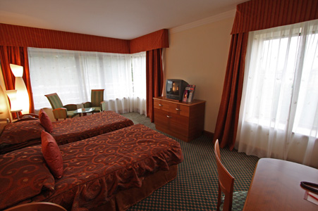 There was a long line to check in. Fortunately Bori had us fill in some registration forms the night before on the boat, so the process went much quicker then I expected. When we looked for our room on the fourth floor, we found that we had a corner room. We walked into a small entry area leading into the main room. WOW!! It was an awesome room. The views were just incredible. We could look out on to the river from either side of the corner windows. Looking the other way as well as from the entry area was the view of a lovely church and a courtyard.