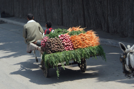 After the last person had agreed to a price and made their purchase, we finally headed to Giza. The drive was interesting, since there were lots of date palm trees and farms to look at. We also passed several donkey powered carts with colorful vegetables piled high.