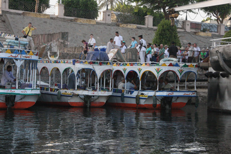 Instead of heading for busses, we were going to take a couple of small open boats across the Nile to meet up with our busses on the west bank. This made it faster to get to the Valley of the Kings; but to get over to the boats, we had a treacherous climb over another boat to get to ours. This was a terrible way to start a tour. I was very concerned about some of the older members of our group being able to maneuver through the boats without hurting themselves, but they made it.