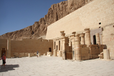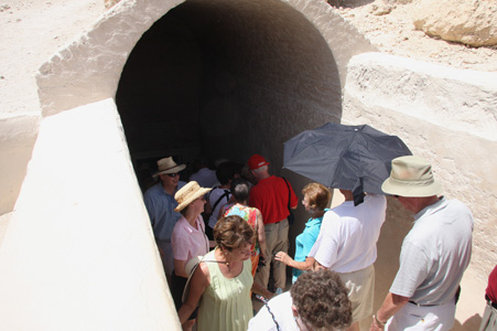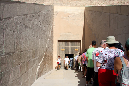 When we got off the tram, we listened to Robert tell us about the tombs we would be visiting. He also pointed out that the mountain at the end of the valley was shaped like a pyramid with a pointed top. Then Carol and I got in the short line to enter KV11, the tomb of Ramses III. It was a relatively easy tomb to visit. There were a few ramps we had to go down, but they were hardly noticed with all the pictures to look at on the walls and ceilings. I was amazed at how large the passage into the tomb was. I had been expecting something narrower with lower ceilings, kind of like in Indiana Jones. This was a much better experience. I wish we could have brought cameras into the tombs, but I do understand why not. Not only would it hurt the experience and slow down the lines through the tombs; but there is no way the camera can capture the beauty of these special places.