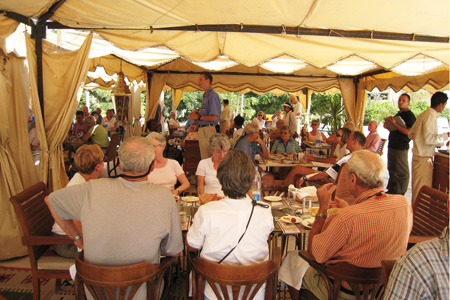 It was exciting to get glimpses of the tops of the pyramids as we got closer. The town of Giza goes right up to the Pyramid grounds. It is a crowded dirty city and takes away from being in the presence of these famous structures. We were told we would be eating at a restaurant that overlooks the Sphinx and Pyramids, which sounded just awesome; but it was an open-air restaurant. I couldn’t imagine eating outside in this intense heat. Due to some security issues, we had to walk a few blocks from the bus to the restaurant in the hot sun and dirty, dusty streets. Thank goodness the tables were covered by a large canvas structure to protect us from the sun. Additionally, most of the time there was a very nice breeze that made the temperature relatively comfortable. We definitely had a table with a view. This would be a lunch to remember.