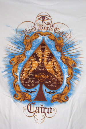 Once again we dragged back into the hotel thoroughly exhausted. The wonderful shower reinvigorated us for what was to be a fun night. Since dinner was not included in our package that night, Leland and Gherry organized a trip over to the Cairo Hard Rock Café for dinner and a felucca ride on the Nile after. This was a great idea. We got a bunch of taxis that cost about $3 for each taxi load to get us there. We were ready for a hamburger, fries and a big glass of iced tea. It really hit the spot. The Cairo Hard Rock Cafe t-shirts were popular. Carol couldn't resist taking a photo of a sign on the inside of restroom.