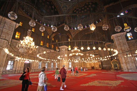 As would be the routine for the rest of our trip, Nivene got the entrance tickets and passed them out to everyone. This worked out quite nicely and we were able to go right in at 9:00 AM. Our destination in the Citadel was the Mohammed Ali Mosque or Alabaster Mosque. This is the most ornate mosque in Cairo. In the middle of the huge courtyard in front of the mosque is an Alabaster drinking fountain.