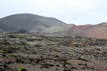 After lunch we headed for Timanfaya National Park. This was when the weather forecast became accurate and the rain began. It wasn’t a heavy rain; but the wind was ruthless. The umbrella’s we brought were useless, since they were blown inside out. Nely tried to be cute and tell us how special we were since Lanzarote only averages about 18 days of rain a year; and we were lucky to be there when it rained. That didn’t help. At least it wasn’t a downpour. With the rain, it was difficult to take photos out of the van windows; but we could see the barren volcanic terrain. There were many volcanos in the distance; but the clouds and rain made it challenging to see them. Fortunately, we had seen lots of them on the way there; but not after we arrived.
