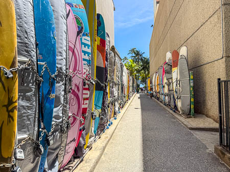 Since we hadn’t eaten lunch, we walked across the street to Duke’s Restaurant. It is in one of the Outrigger Waikiki Beachcomber buildings on the water. Next to the building is a beach access that has surfboards locked and stored on both sides of the alleyway.