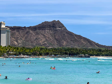 After lunch, we wanted to do a hop-on-hop-off bus, but the last routes started at 3:00 PM, which we missed. The hotel concierge told us that there was a shopping type HOHO bus that we could get on to have an easy tour around the Waikiki Beach area to see some of the sights. The pickup location was a couple blocks away in front of the Duke Kahanamoku statue. Duke, whom the restaurant we just ate at was named for is considered the father of modern surfing. He was also an Olympian winning swimming gold medals in the 1912 and 1920 Olympics and a silver medal in 1924 at the age of 34. The 9-foot-tall bronze statue is a popular photo opp.