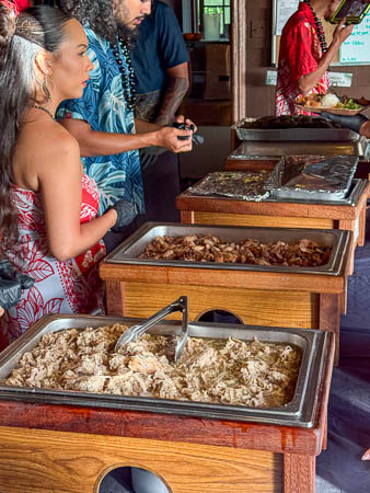 We then moved to the buffet area where there were several items to put on our plates. There was a local style BBQ chicken, a steamed pork and butterfish with luau leaf, authentic emu cooked pork and taro burger with gravy. Everything was quite tasty.