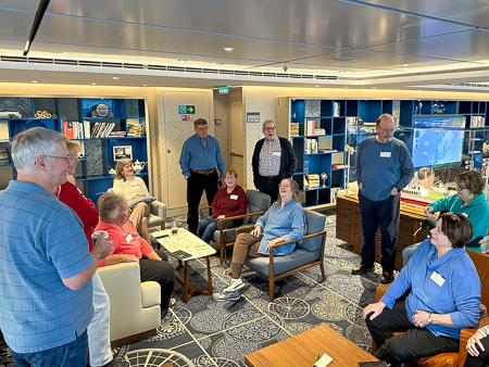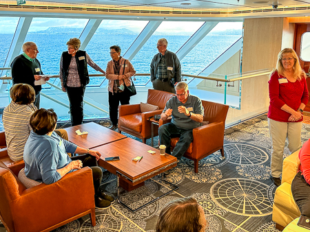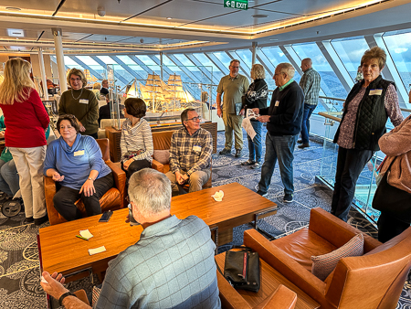Cruise Critic Meet and Mingle (www.cruisecritic.com) – Our Cruise Critic rollcall group with whom we had been communicating for many months wanted to have a get together early in the cruise similar to the pre-Covid Cruise Critic Meet and Mingle that the cruise lines supported. This was a way for us to be able to meet face to face the folks we had been chatting with on the forum. Normally the cruise director and other members of the staff would also be in attendance and talk with us. Sometimes the captain would even join us. So, we decided to just have an unofficial meeting on the second level of the Explorer’s Lounge on the first sea day. It worked out very well and it was so nice to match faces with names.