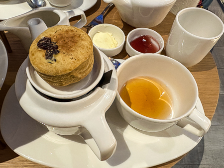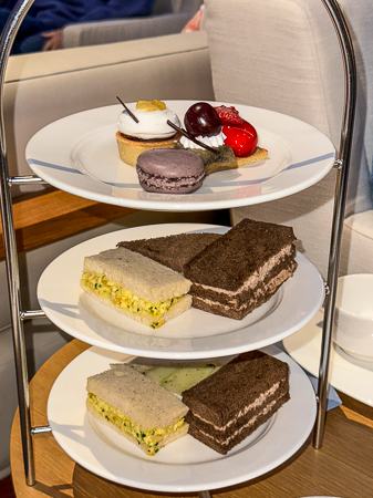 Each day from 4:00 PM – 5:00 PM, afternoon tea was served in the Wintergarden. It was a very well attended activity and seats were at a premium many days. A three-tiered tray with small sandwiches and treats were delivered first. Then a pot of tea was brought next. A crumpet with clotted cream and jelly came next. It was quite an enjoyable break in the day. I only did it once, since I didn’t want to fill up before our early dinner. There wasn't much room on the small table I was sitting next to, but hopefully you get an idea of what was served.
