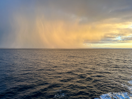 Once we left the Bergen fjord, the seas became quite rough, but it only lasted for about an hour. At 6:30 PM, the captain made an announcement that there was a medical emergency that would require us to go back to Bergen. That could mean a 6–7-hour delay getting to Alta. An hour later, he announced that the ship was stopping to allow a helicopter to drop a basket to pick up the passenger. That was great news for everyone, especially the patient and family.